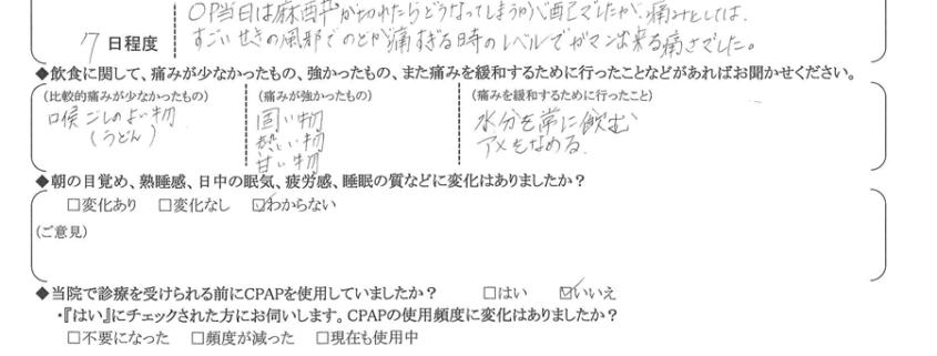 Q.術後、強い痛みは何日程度続きましたか?また、痛みの度合いについて具体的なご意見をお聞かせください。