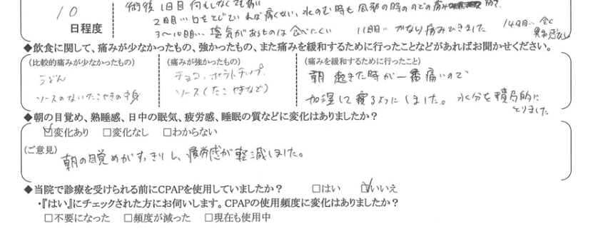 (理由)  術中・術後の痛みさえ乗り越えれば、違和感も無くなり悩んでいたいびきも改善されたので、是非すすめたいと思います。