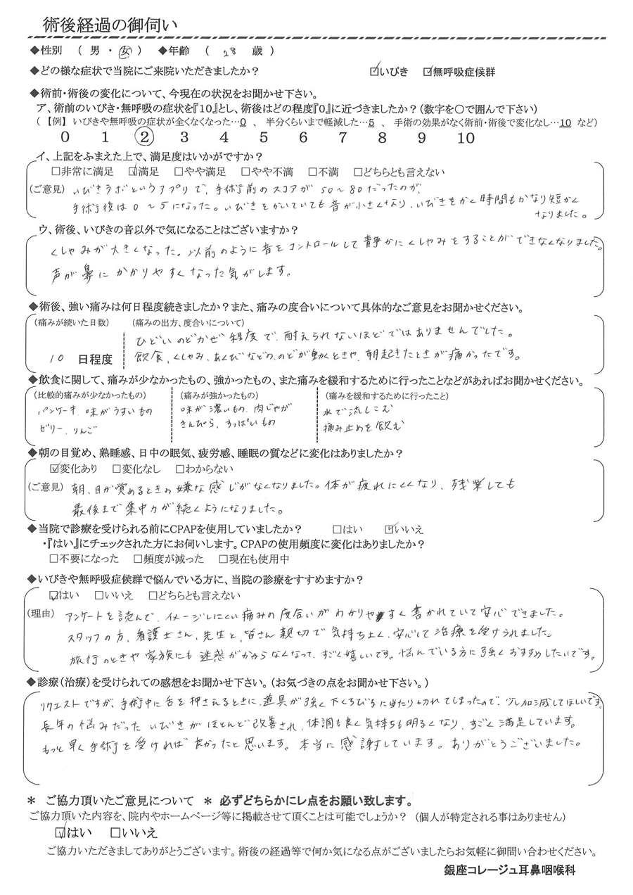 A: リクエストですが、手術中に舌を押さえる時に道具が強く下唇の当り、切れてしまったので少し加減してほしいです。長年の悩みだったいびきがほとんど改善され、体調も良く気持ちも明るくなり、凄く満足しています。