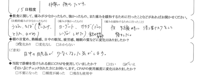 A: 2週間程、痛みが強くて大変でしたが、いびきがかなり軽減したので治療をして良かったと思います。