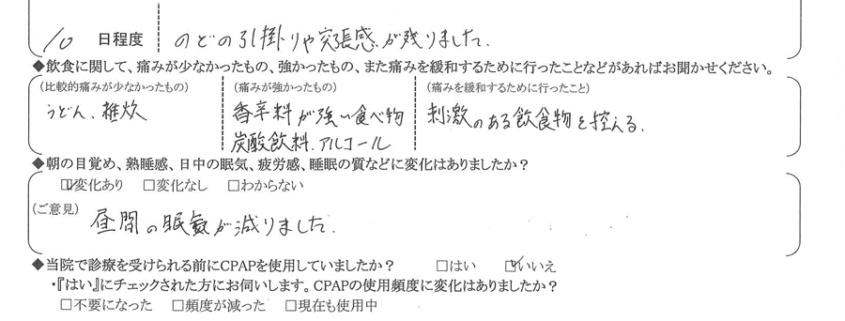 (痛みの程度について) 喉の引っ掛かりや突っ張り感が残りました。