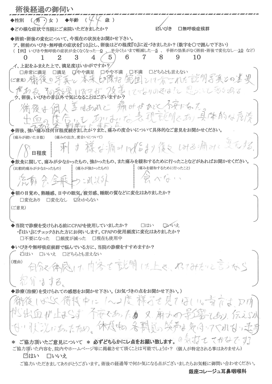 (ご意見)  術後の写真と本来切除する範囲として示された説明写真との差異がある。その結果、いびきが改善していないのでは?と思う事も多々ある。
