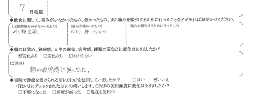 (ご意見) 妻からは口呼吸はしているが、いびきではなく寝息が聞こえる程度になったと言われました。