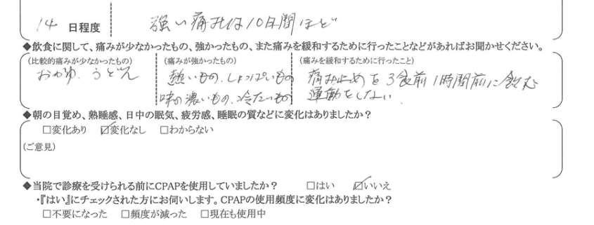 A:(痛みが強かったもの)  熱い物、しょっぱい物、味の濃い物、冷たい物