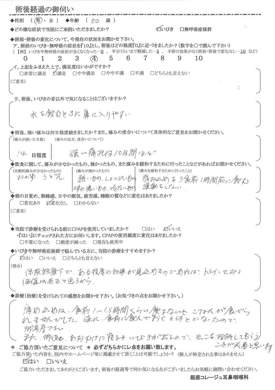 A: 痛み止めは、食前1~1.5時間くらい飲まないとご飯が食べられませんでした。逆に食前に飲んでおくと何とかなったのでご考慮下さい。また術後も仰向けに寝るとイビキが出るので、そこを理解してもらうことが必要と思います。