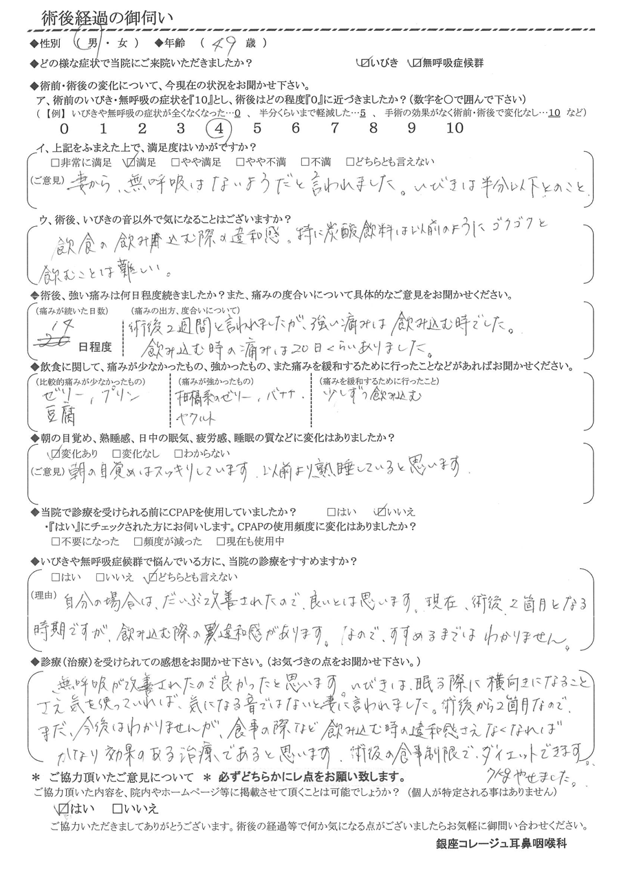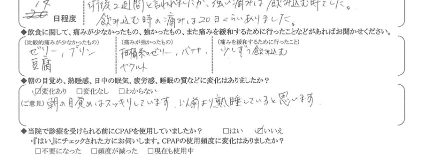 A: 無呼吸が改善されたので良かったと思います。いびきは眠る際に横向きになる事さえ気を遣っていれば、気になる音ではないと妻に言われました。術後から2ヶ月なのでまだ今後は分かりませんが、食事の際など、飲み込む時の違和感さえなくなればかなり効果のある治療であると思います。術後の食事制限でダイエットできます。7㎏痩せました。