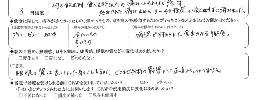 (ご意見) 睡眠の質は良くなった気がしますが、どこまで手術の影響かは正直よく分かりません。