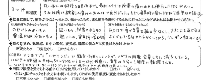 (ご意見) スマホアプリ「いびきラボ」で録音・計測しているが、いびきの回数・音量ともに減少している。