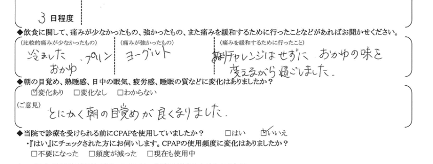 Q.術後、強い痛みは何日程度続きましたか?また、痛みの度合いについて具体的なご意見をお聞かせください。