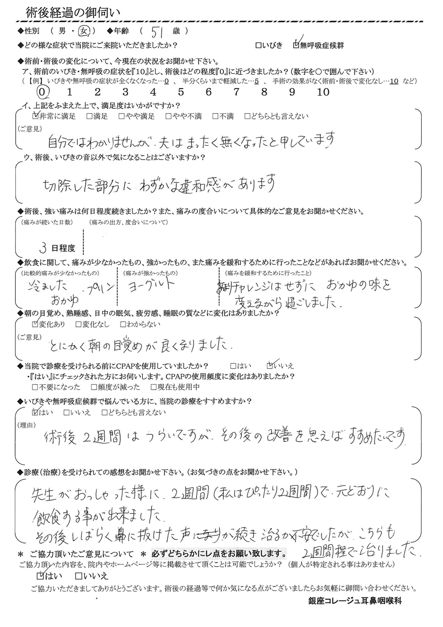 ア, 術前のいびき・無呼吸の症状を『10』だったとすると、術後はどの程度になりましたか? 【0】