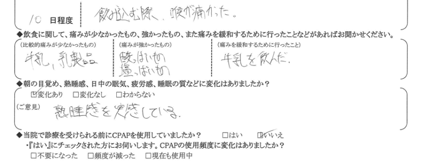 (痛みの程度について) 飲み込む際、喉が痛かった。
