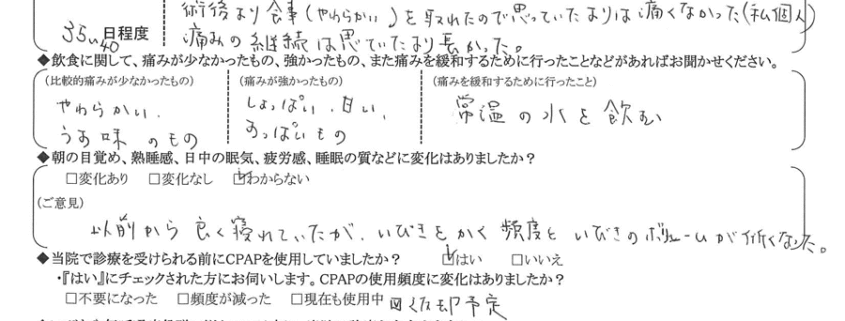 (痛みの程度について) 術後より食事(柔らかい)を摂れたので、思っていたよりは痛くなかった。(私個人)