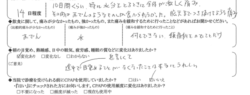 (痛みの程度について) 10日間くらい、特に水分を摂る時に全体が激しく痛み、その間はおでんの様な物しか食べられなかった。脳天まで突き抜ける様な痛み。