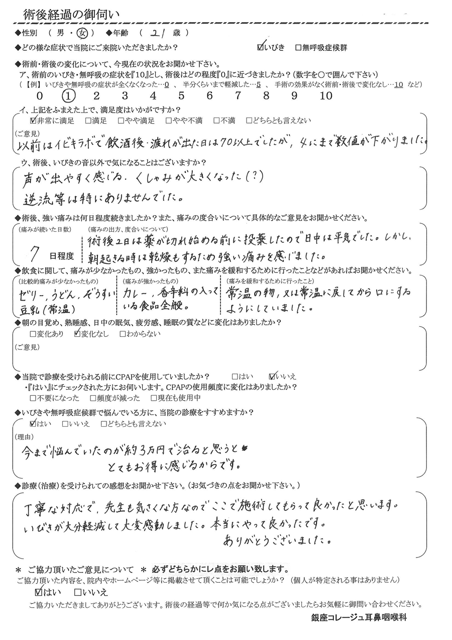 A: 丁寧な対応で、先生も気さくなので、ここで施術してもらって良かったと思います。いびきが大分軽減して大変感動しました。本当にやって良かったです。ありがとうございました。