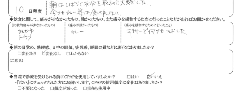 (痛みの程度について) 朝はしばらく水分を摂るのも大変でした。今でもカレー等は食べれない。
