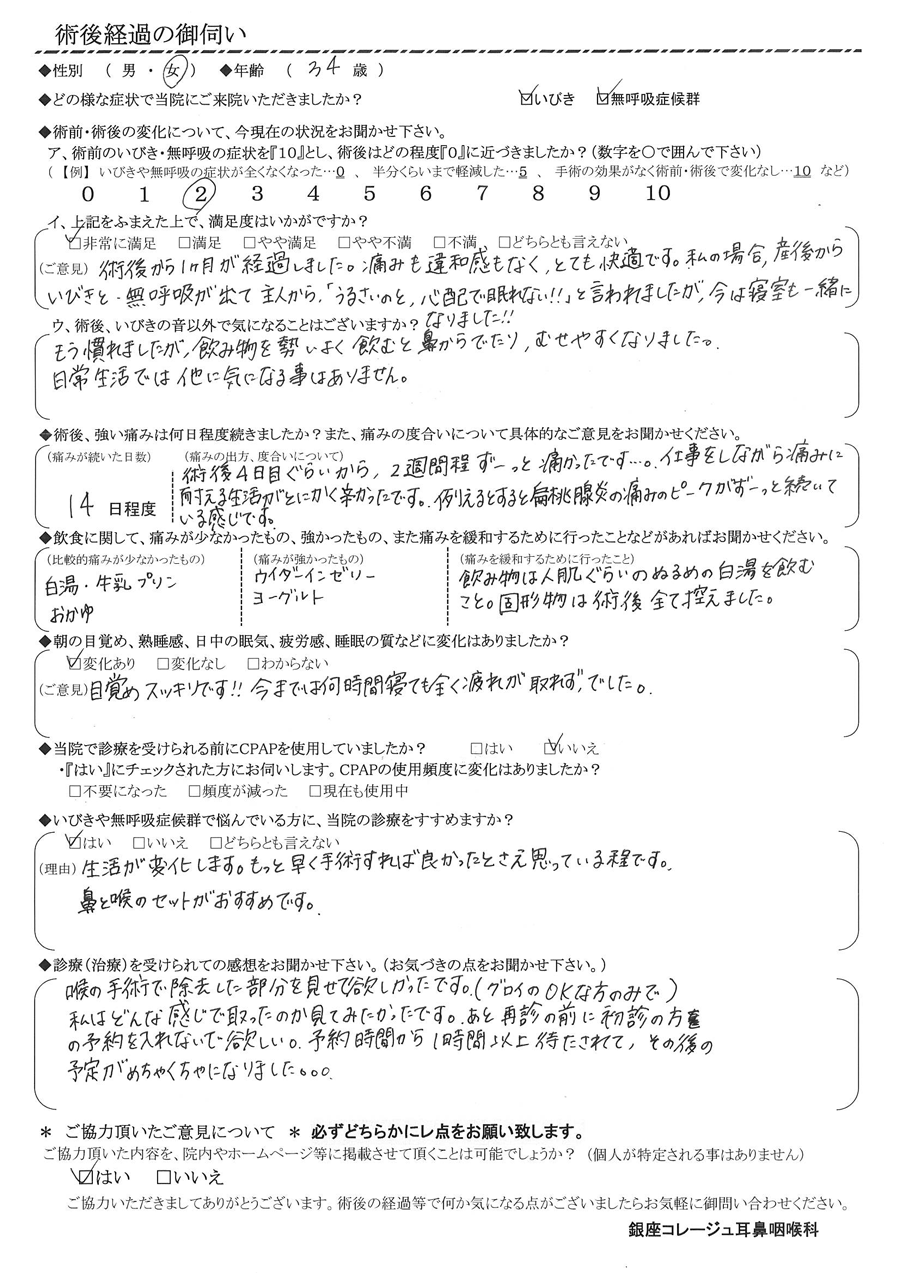 (ご意見) 術後から1ヶ月が経過しました。痛みも違和感もなく、とても快適です。私の場合、産後からいびきと無呼吸が出て、主人から「うるさいのと、心配で眠れない!!」と言われましたが、今は寝室も一緒になりました!!