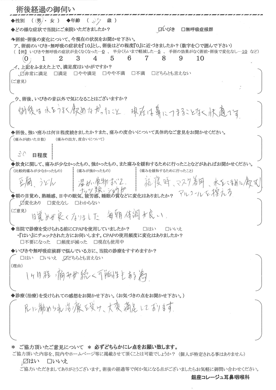 ア, 術前のいびき・無呼吸の症状を『10』だったとすると、術後はどの程度になりましたか? 【0】