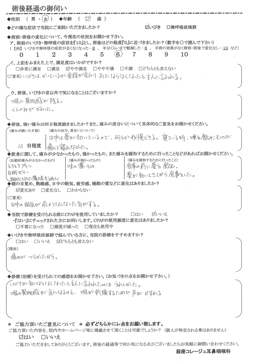 A: いびきが気にならなくなったと主人に言われたのは嬉しかった。喉の異物感が気になるのと、喉が乾燥するためか、声がかすれる。