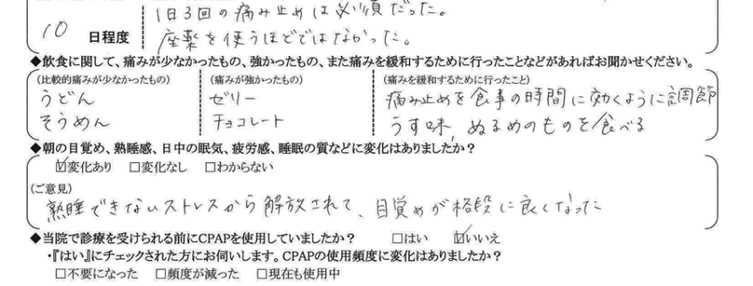 (痛みの程度について) 1日3回の痛み止めは必須だった。座薬を使う程ではなかった。
