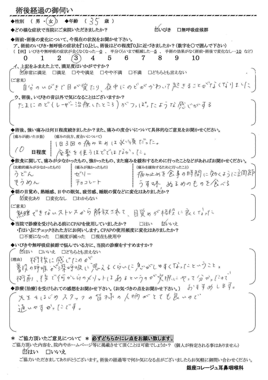ア, 術前のいびき・無呼吸の症状を『10』だったとすると、術後はどの程度になりましたか? 【3】
