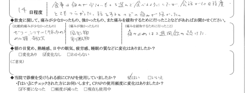 (痛みの程度について) 食事は痛みが少ない物を選んで食べるようにしたが、会話が10日程度とても辛かった。