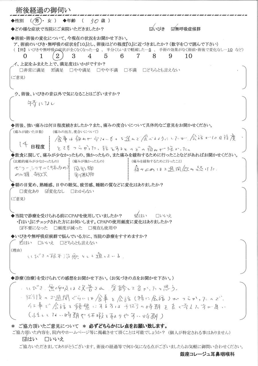 A: ・いびき・無呼吸は改善され、受診して良かったと思う。