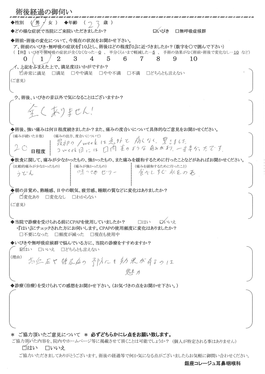 ア, 術前のいびき・無呼吸の症状を『10』だったとすると、術後はどの程度になりましたか? 【1】