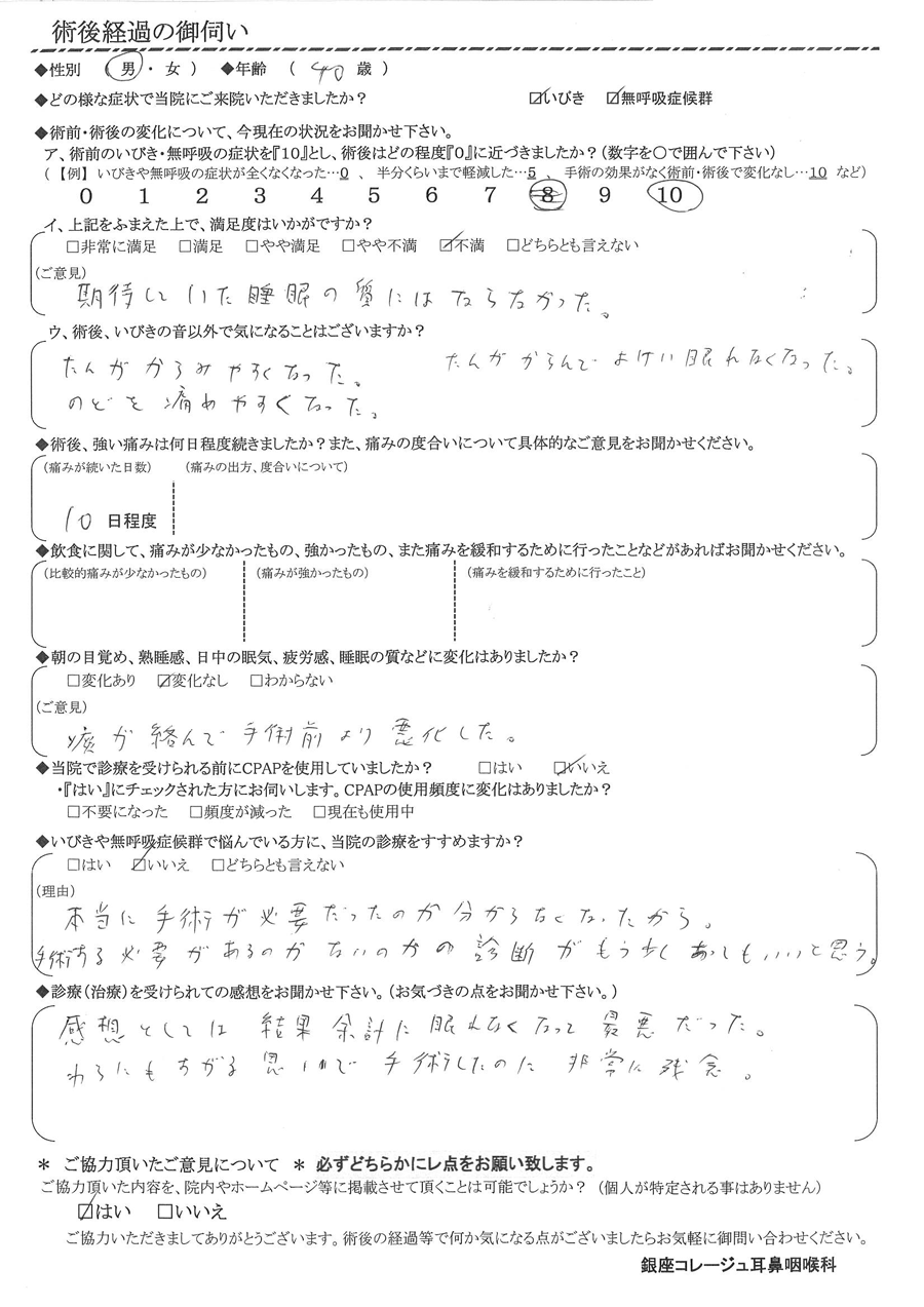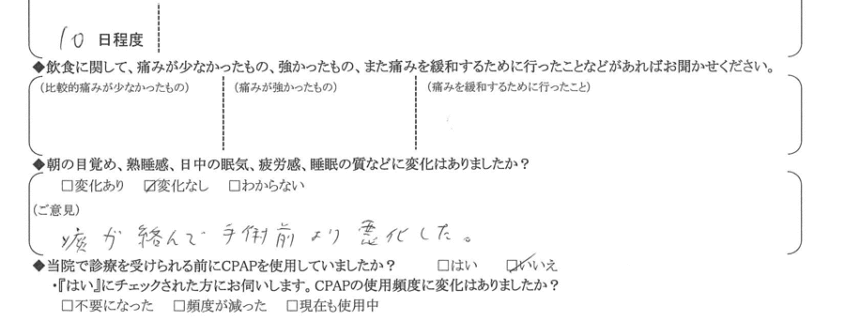 A: 感想としては、結果余計に眠れなくなって最悪だった。藁にもすがる思いで手術したのに非常に残念。