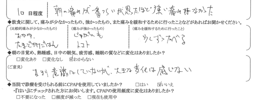 (痛みの程度について) 朝の痛みが一番辛いが、思ったほど強い痛みはなかった。