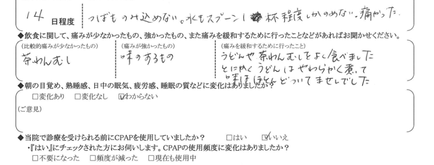 A:(痛みを緩和するために行ったこと) うどんや茶碗蒸しをよく食べました。とにかく、うどんは軟らかく煮て味はほとんどついてませんでした。