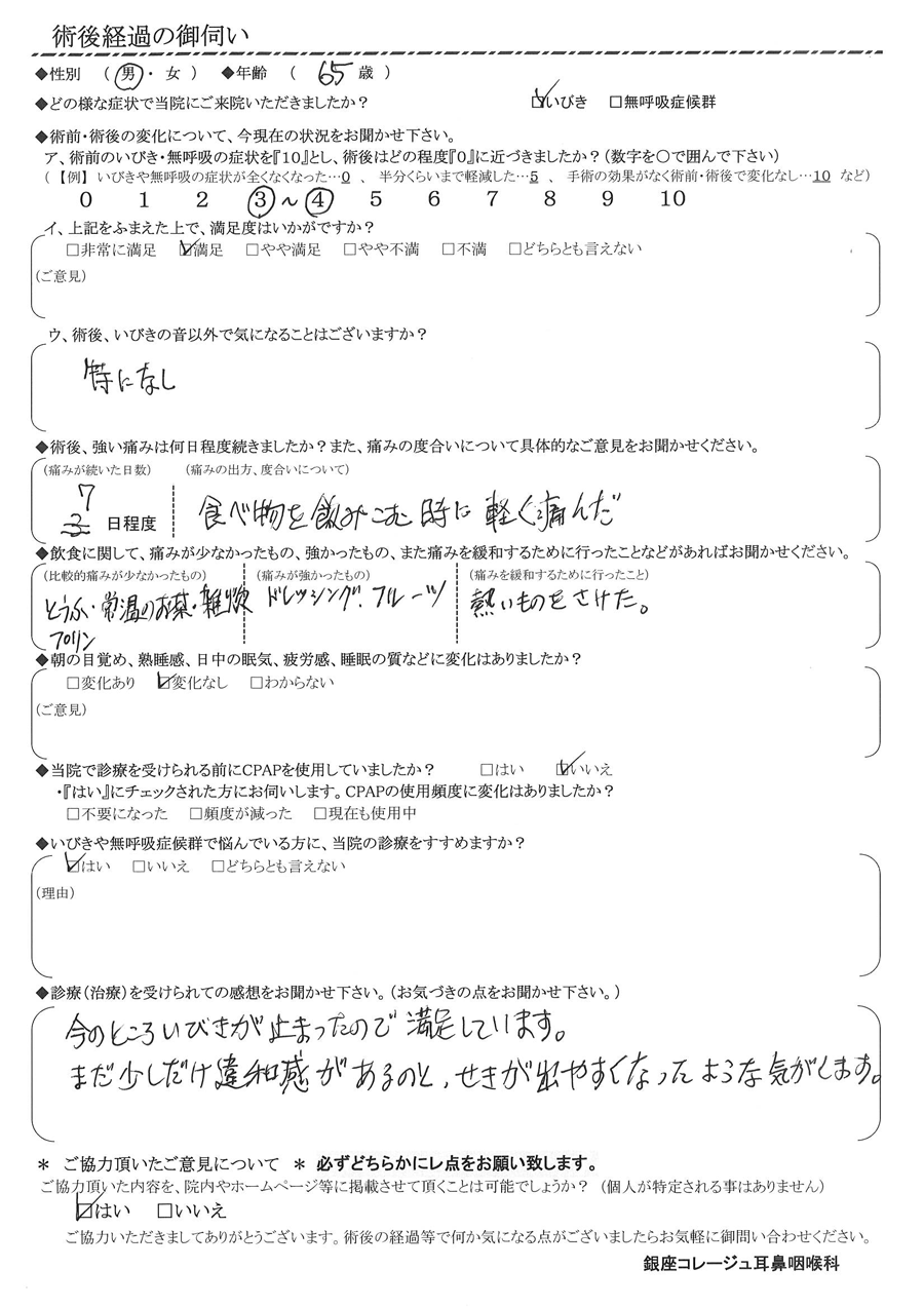 A: 今のところ、いびきが止まったので満足しています。まだ少しだけ違和感があるのと、咳が出やすくなったような気がします。