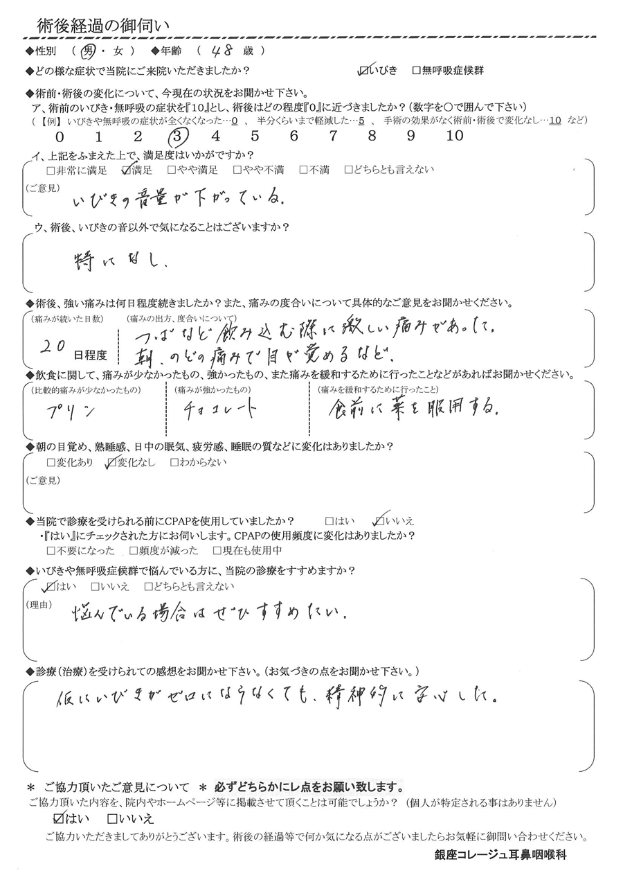 A: 仮にいびきがゼロにならなくても、精神的に安心した。