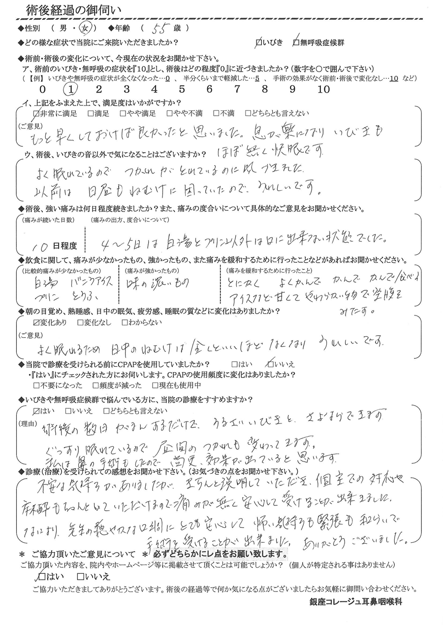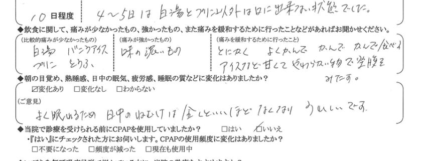 (ご意見) もっと早くしておけば良かったと思いました。息が楽になり、いびきもほぼ無く快眠です。