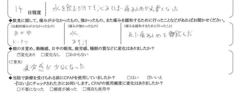 (痛みの程度について) 水を飲むだけでも、沁みてしまい、痛み止めが必要となった。