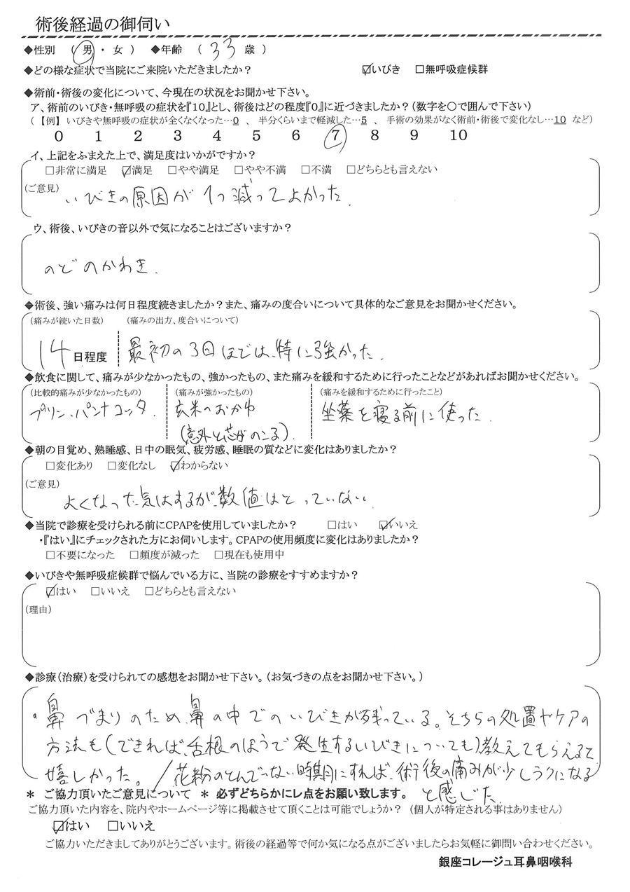 A: 鼻づまりの為、鼻の中でのいびきが残っている。そちらの処置やケアの方法も(できれば、舌根の方で発生するいびきについても)教えてもらえると嬉しかった。花粉の飛んでない時期にすれば、術後の痛みが少しラクになると感じた。