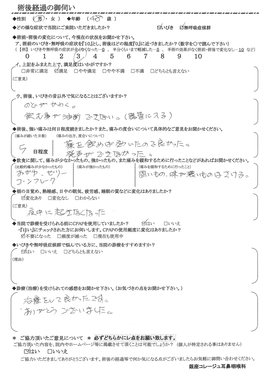 ウ、術後、いびきの音以外で気になる点はございますか?