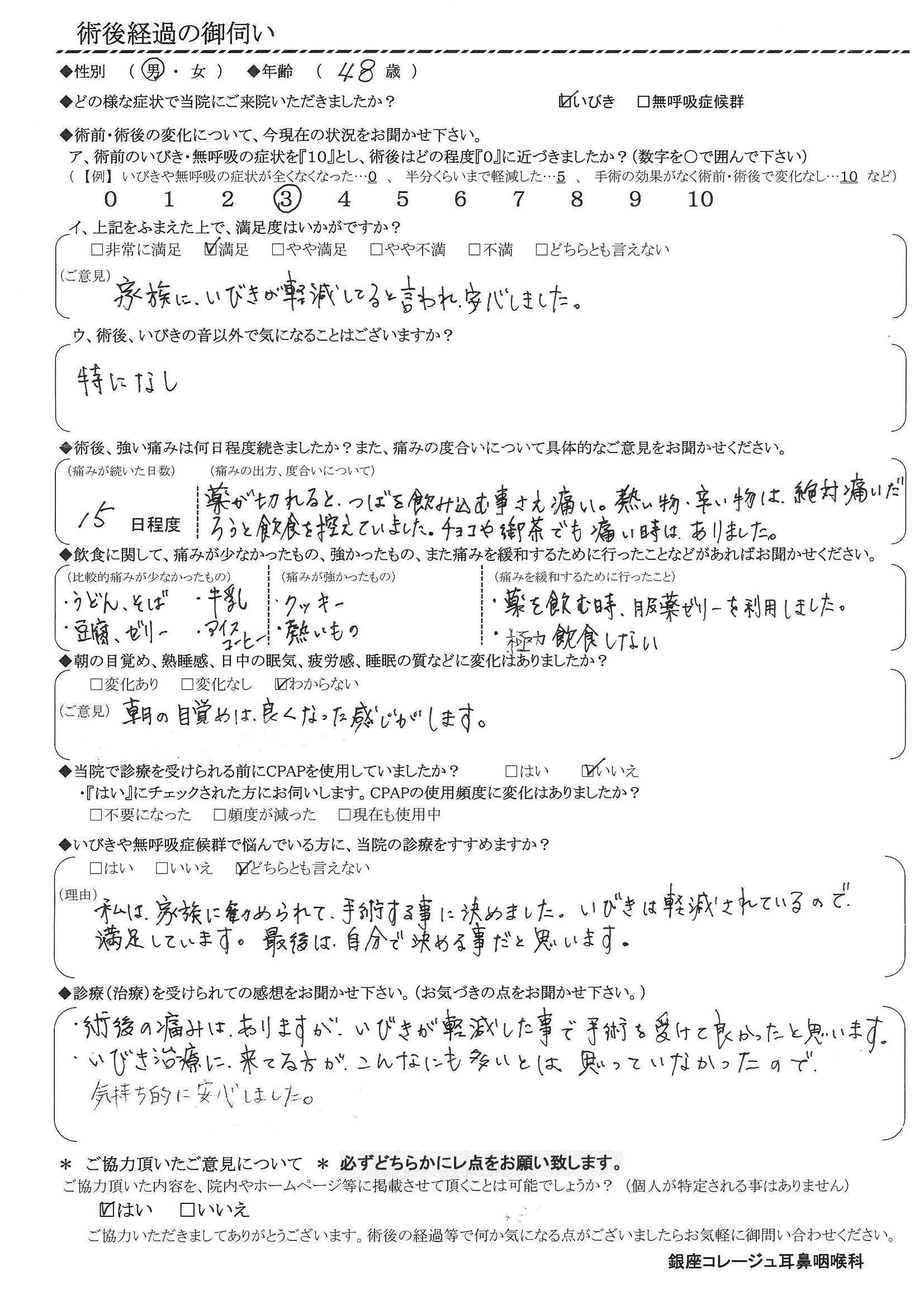 (理由) 私は家族に勧められて、手術する事に決めました。いびきは軽減されるので、満足しています。最後は、自分で決める事だと思います。