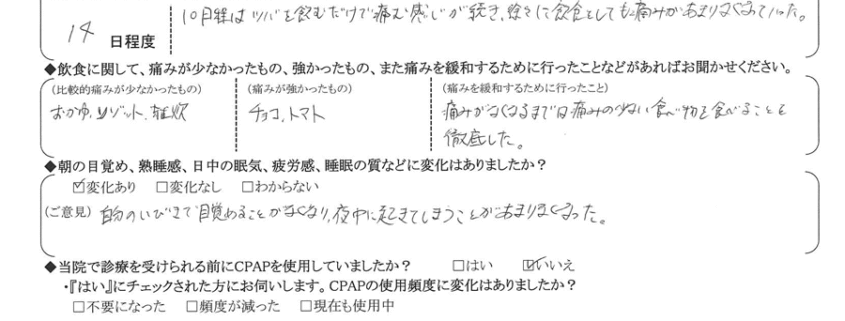 A:(痛みを緩和するために行ったこと) 痛みが無くなるまでは痛みの少ない食べ物を食べることを徹底した