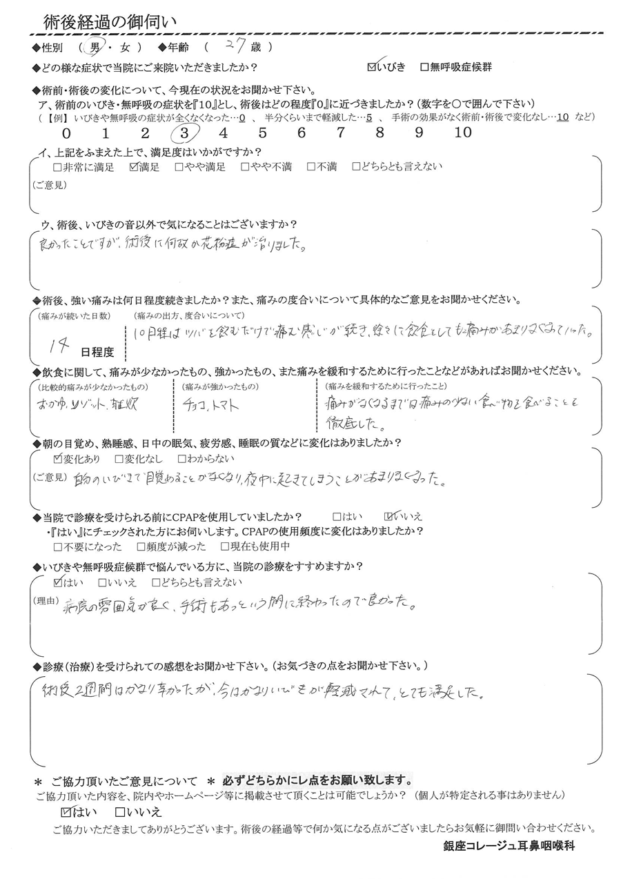 A: 術後2週間はかなり辛かったが、今はかなりいびきが軽減されて、とても満足した。