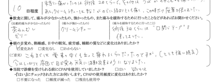 (ご意見)  これまでは電車の中でも立って寝れるくらいだったのですが、(とても強い眠気)今はしっかりと布団で目覚め、元気に活動できるようになりました。