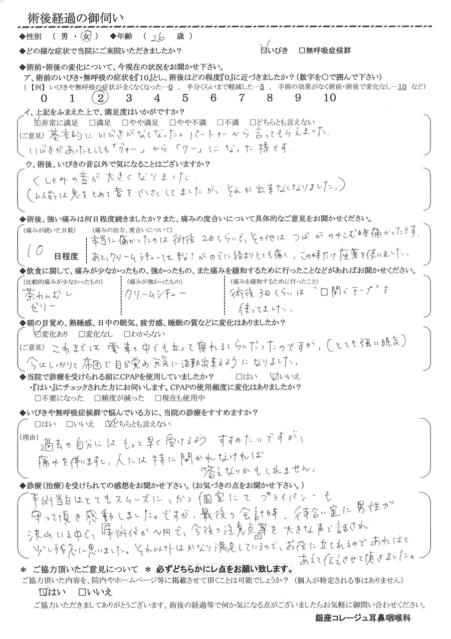 ア, 術前のいびき・無呼吸の症状を『10』だったとすると、術後はどの程度になりましたか? 【2】