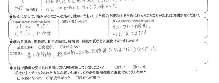(ご意見) 鼻の手術後、起床時によくあった頭痛があまり起こらなくなった。