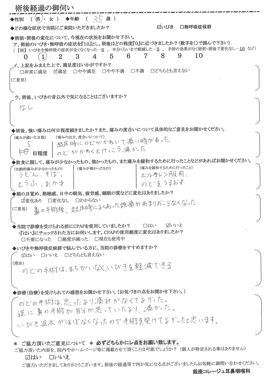 A: 喉の手術は思ったより痛みが無くて良かった。逆に、鼻の手術が自分が思っていたより痛かった。いびき症状がほぼ無くなったので、手術を受けて良かったと思います。