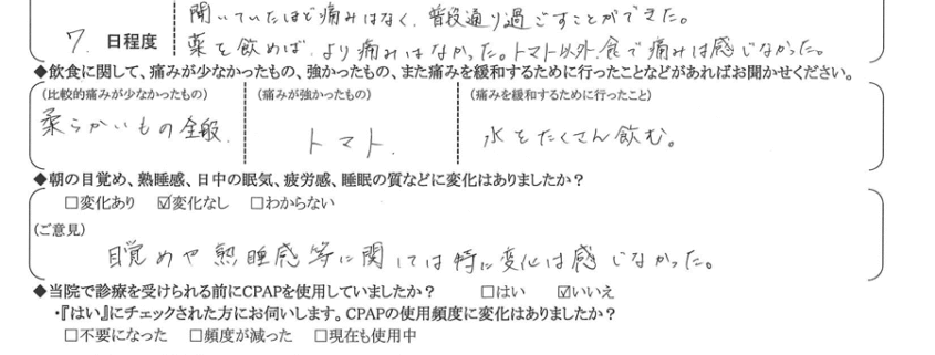 (ご意見) いびきが全く無くなった訳ではないが、少なくなり、いびきをかいた時の質も変わった。パートナーにも寝やすくなったと言われた。