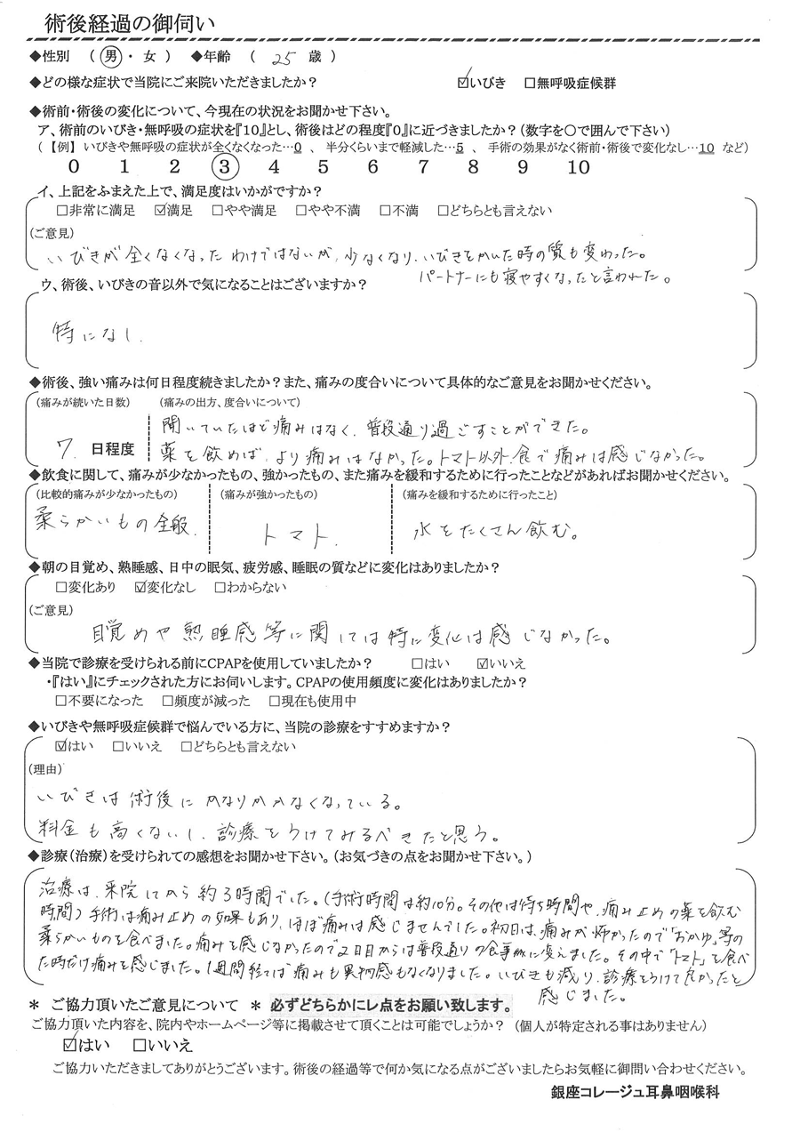手術は痛み止めの効果もあり、ほぼ痛みは感じませんでした。初日は痛みが怖かったので「おかゆ」等の柔らかい物を食べていました。痛みを感じなかったので2日目からは普通通りの食事に変えました。その中で「トマト」を食べた時だけ痛みを感じました。1週間経てば痛みも異物感もなくなりました。いびきも減り、診療を受けて良かったと感じました。