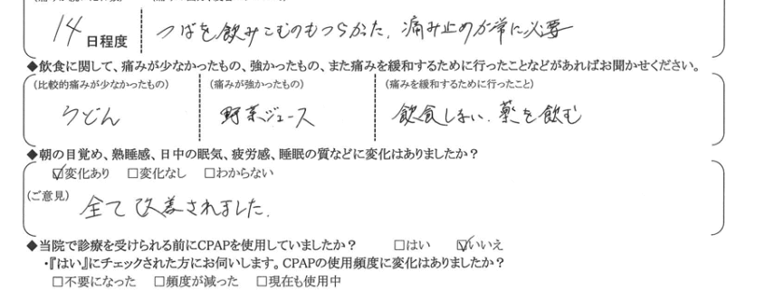 (痛みの程度について) 唾を飲み込むのも辛かった。痛み止めが常に必要。