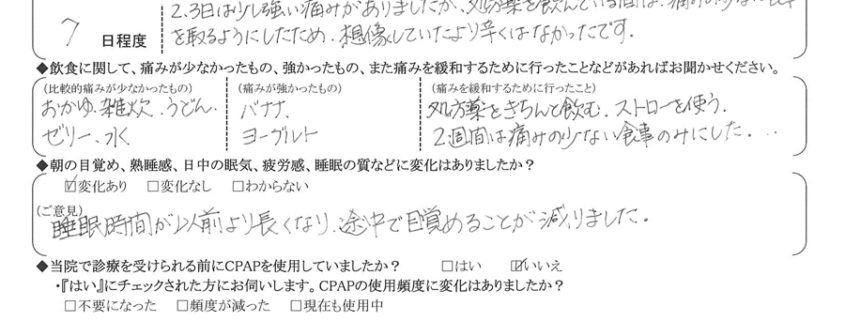 (ご意見) 術後2週間くらいは、手術前よりもいびきが酷くなり、自分には効果が無かったのかもと落胆していましたが、その後、いびきがほとんど無くなり本当に良かったです。