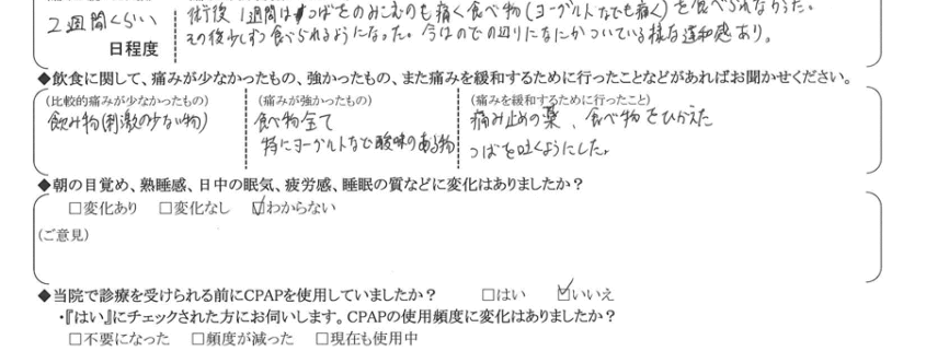 (痛みの程度について) 術後1週間は唾を飲み込むのも痛く、食べ物(ヨーグルトなども痛く)を食べられなかった。