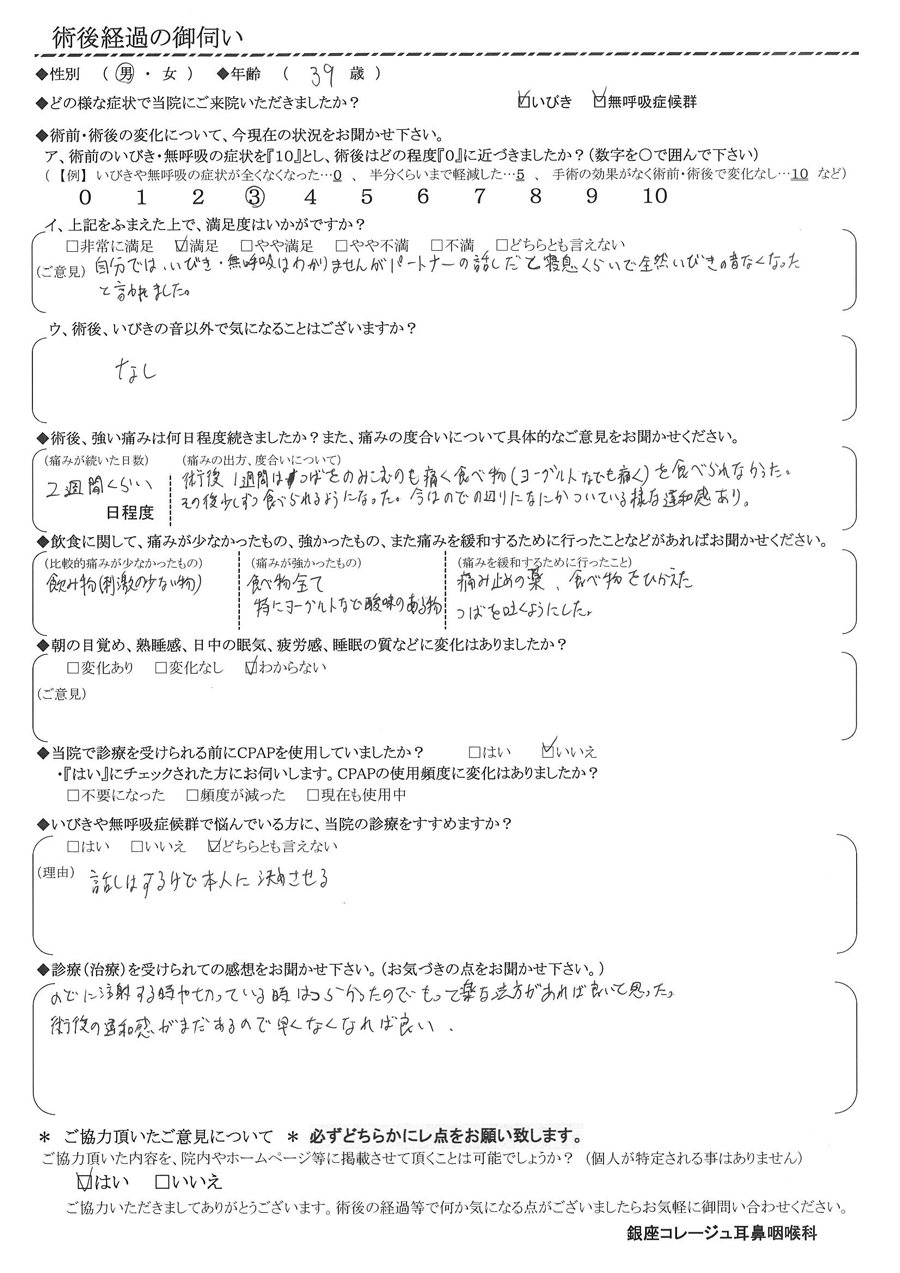 ア, 術前のいびき・無呼吸の症状を『10』だったとすると、術後はどの程度になりましたか? 【3】