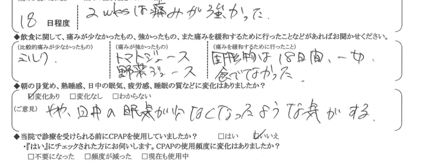 A: 痛みが想像以上に強く、長く続いた。が、お陰で減量もできた。いびきも無くなり、手術をして良かった。